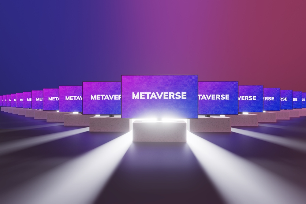 Published 27. Dezember 2021 at 1000 × 667 in 3d,Rendering,Of,Metaverse,Concept,Message,On,Tv,Screens,Showing